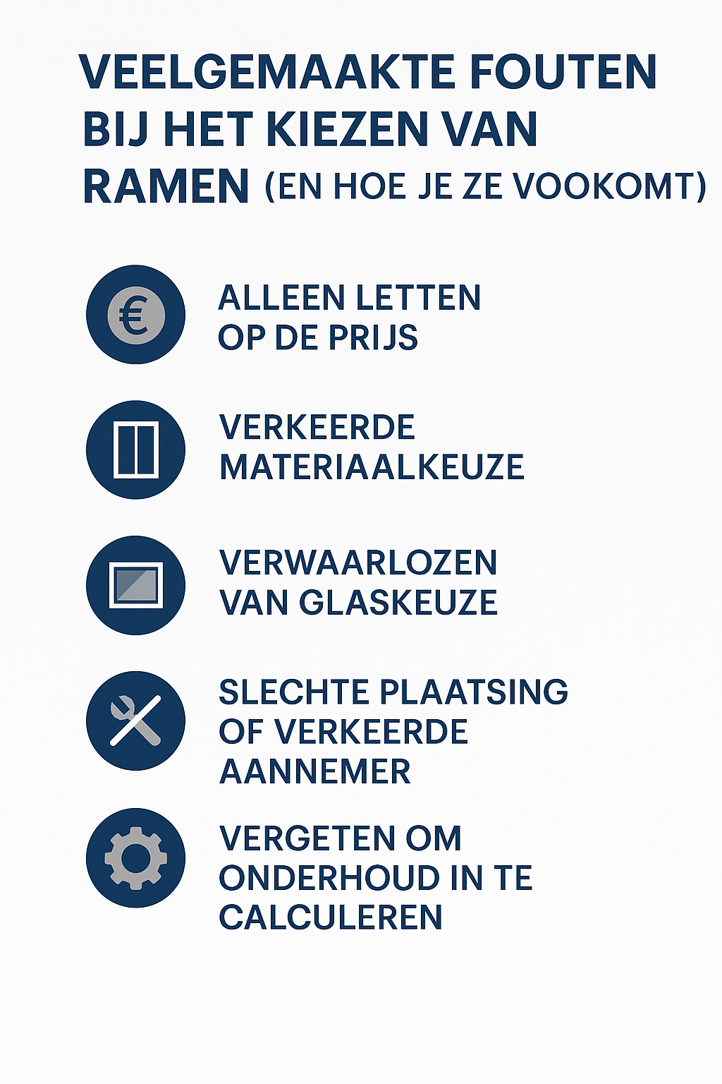 Nieuwe ramen zijn een investering die jarenlang meegaat. Ze bepalen niet alleen het uitzicht van je woning, maar ook het comfort, de energie-efficiëntie en de waarde van je huis. Toch worden er bij het kiezen van ramen nog vaak fouten gemaakt ,meestal uit onwetendheid of omdat men enkel op prijs focust. Hier zijn de meest voorkomende valkuilen én hoe je ze eenvoudig kunt vermijden.